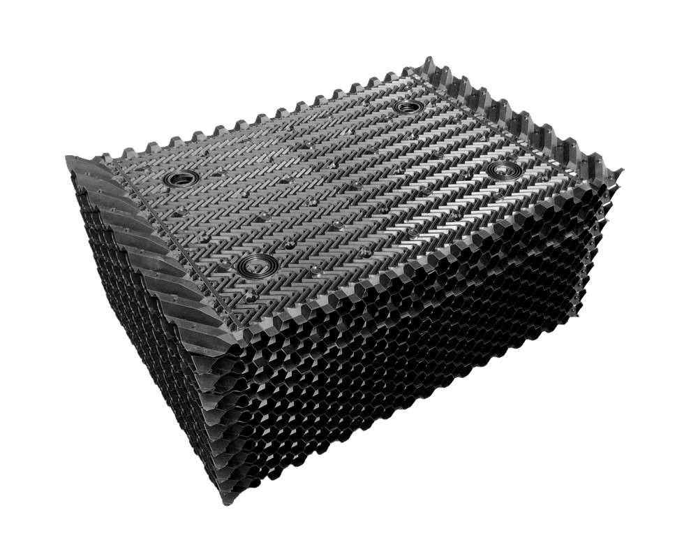 本公司散热填料有不粘接悬挂式,也有堆砌式,安装简便,便于清洗,且成功解决了粘接填料因吸尘积垢、自重而产生变形,且变形后积垢更加严重、难于清洗的问题。填料阻燃性能好,经检测:阻燃氧指数指标大于30。