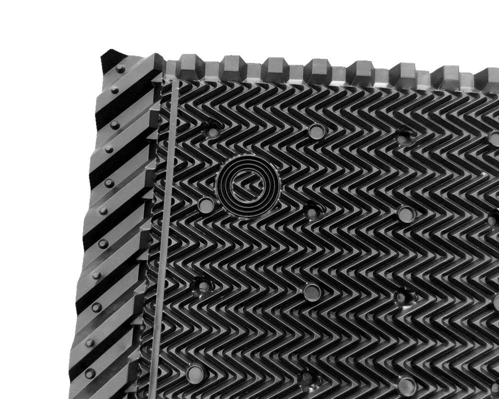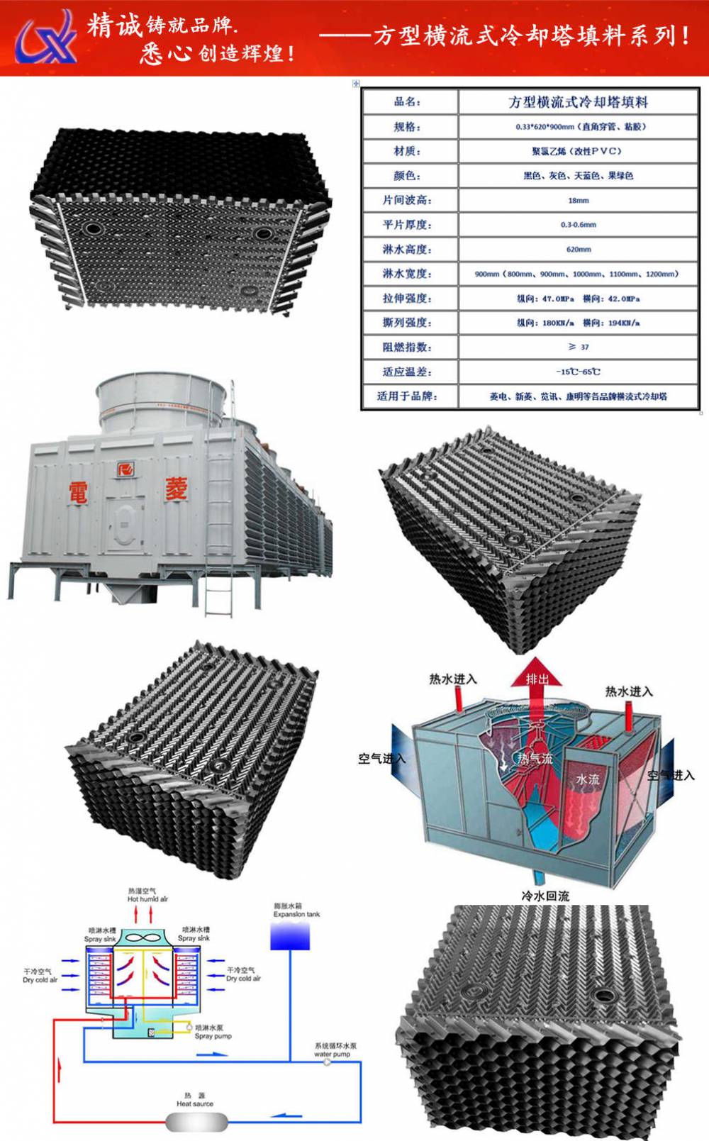 六、飘水率低于循环水量的0.001%,采用自带收水器及进风百叶三合一设计;该填料采用阻燃PVC真空吸塑而成,