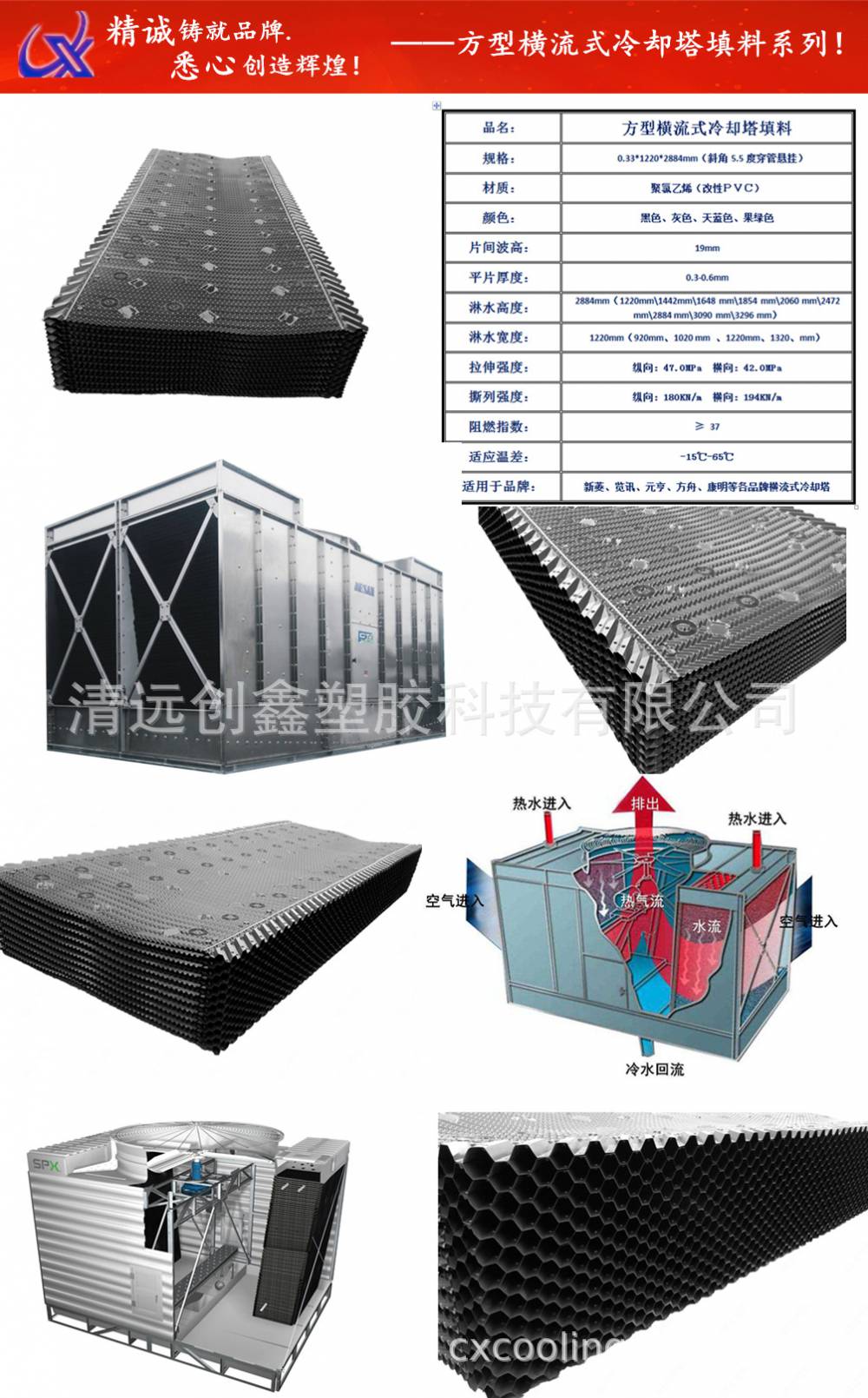 六、飘水率低于循环水量的0.001%,采用自带收水器及进风百叶三合一设计;该填料采用阻燃PVC真空吸塑而成,