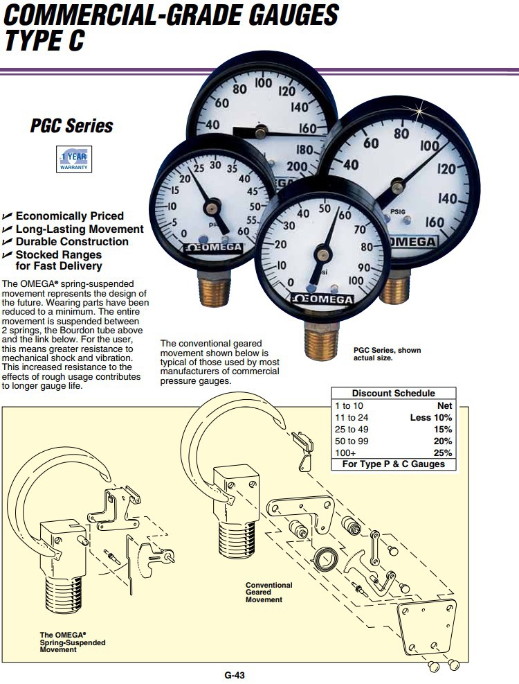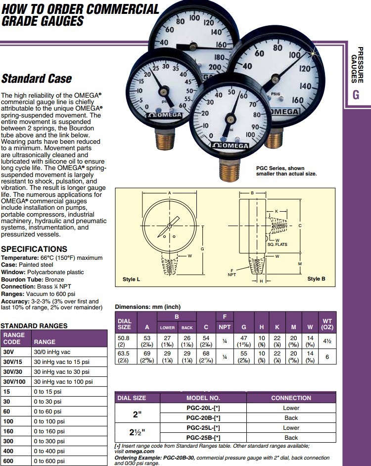美国OMEGA奥米佳压力表PGC-20L-30V,PGC-20L-30V/15,PGC-20B-30V/30