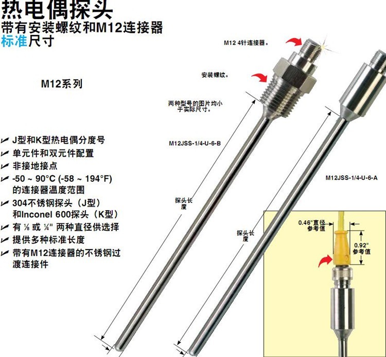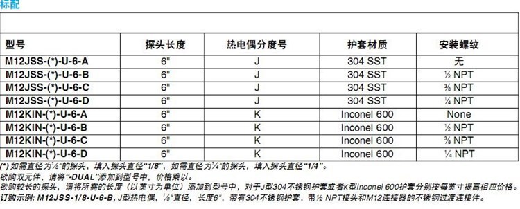 美国OMEGA奥米佳M12KIN-1/8-U-6-A-B-C-D热电偶M12KIN-1/4-U-6-A-B-C-D