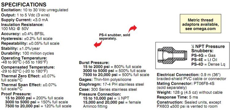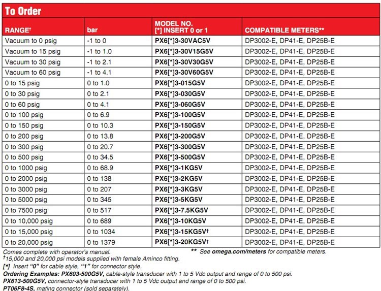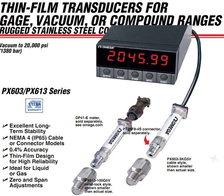 美国OMEGA奥米佳压力传感器PX603-200G5V,PX603-300G5V,PX613-500G5V