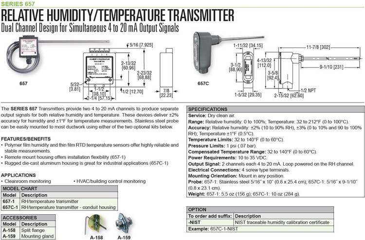 美国Dwyer德威尔一体式和分体式可选温湿度变送器657-1,657C-1