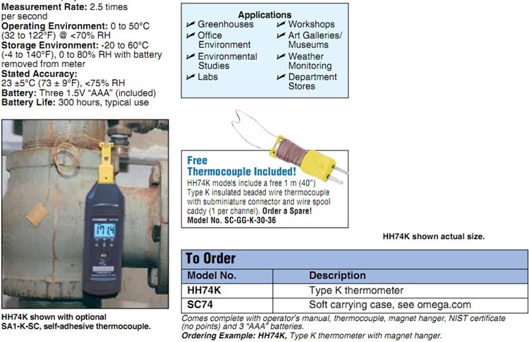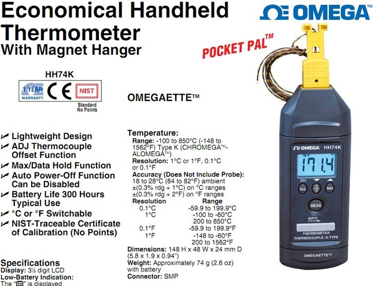 美国OMEGA奥米佳HH74K手持温度计K型热电偶输入SC74,HH74K