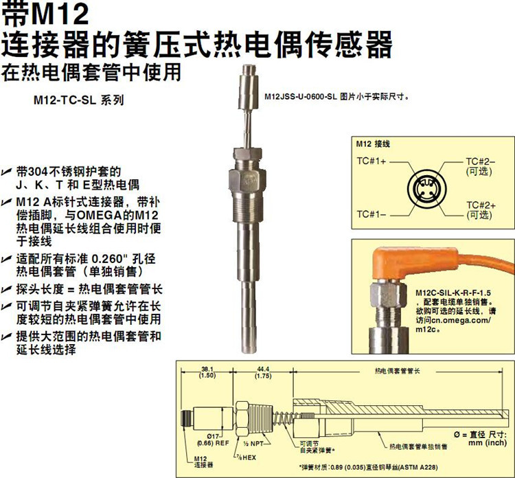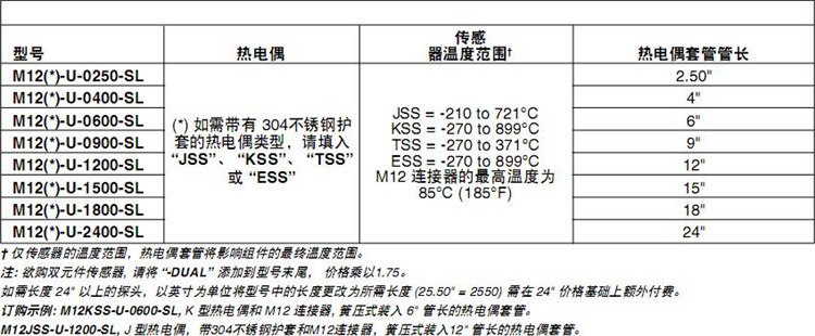 OMEGA奥米佳热电偶M12JSS-U-0250-0400-0600-0900-1200-1800-2400-SL