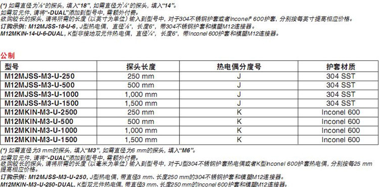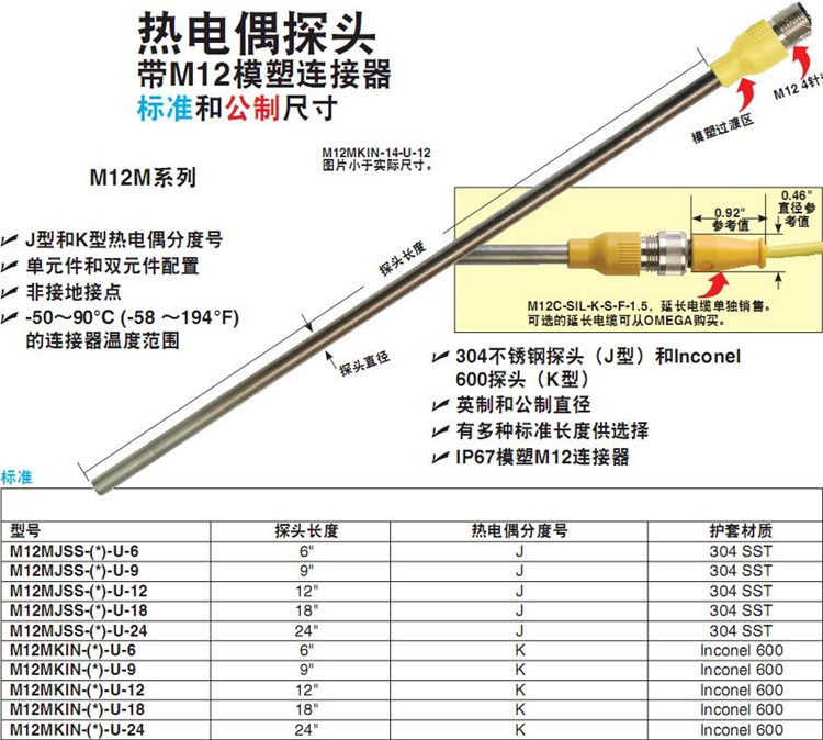美国OMEGA奥米佳热电偶M12MJSS-1/8-U-6,M12MKIN-1/4-U-9,12,18,24