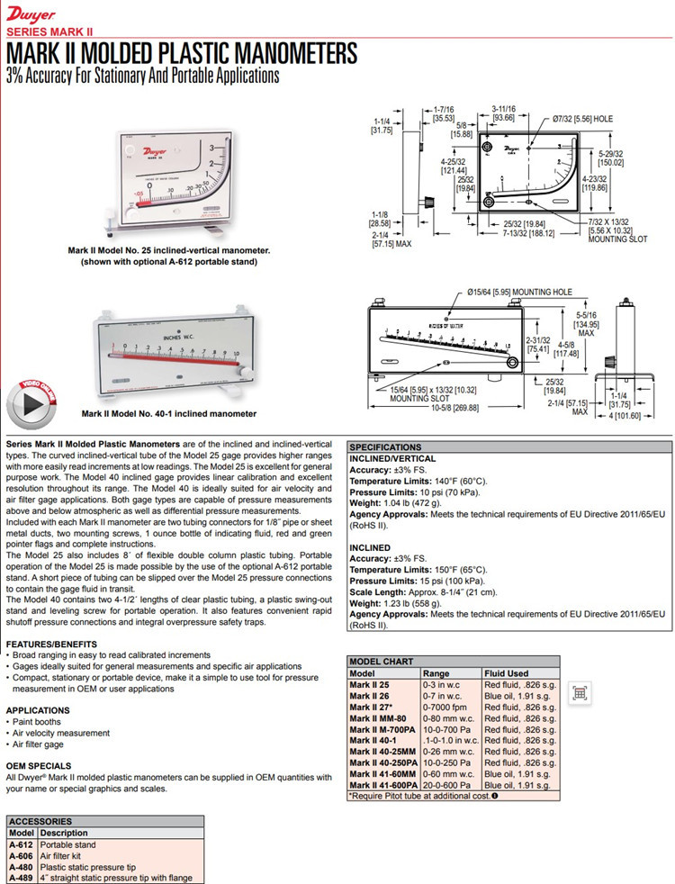 美国Dwyer德威尔Mark II 40-1压差计Mark II 40-25MM,40-250PA