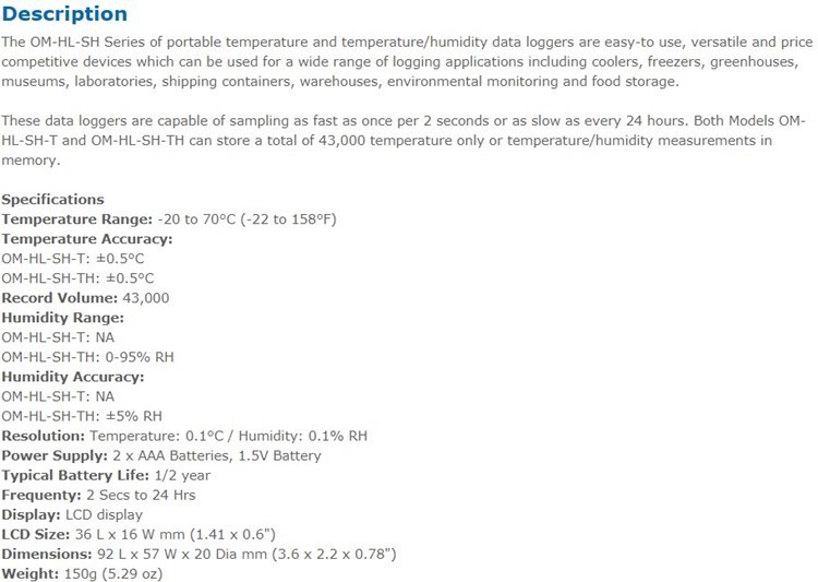 OMEGA奥米佳温湿度数据记录仪OM-HL-SH-T,OM-HL-SH-TH,OM-HL-SH-TH-CAL