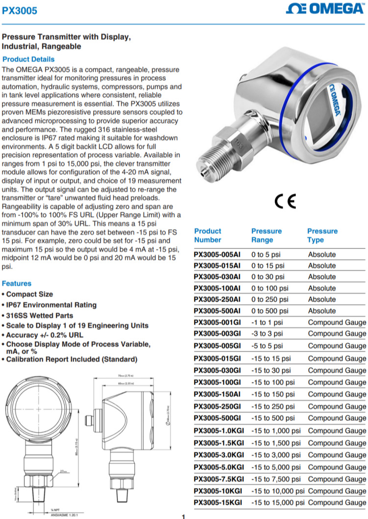 美国OMEGA奥米佳压力变送器PX3005-10KGI,PX3005-15KGI,PX3005-3.0KGI