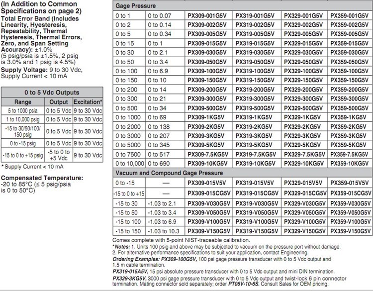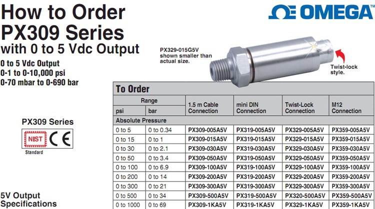 美国OMEGA奥米佳压力传感器PX309-050G5V,PX309-100G5V,PX319-150G5V