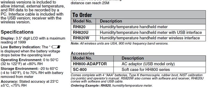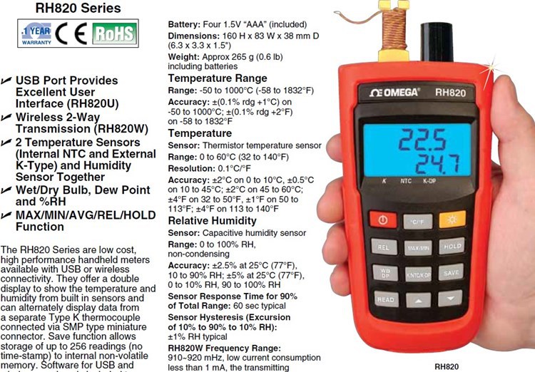 美国OMEGA奥米佳手持测温仪温湿度计仪表RH820,RH820U,RH820W