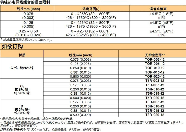 美国OMEGA奥米佳热电偶T5R-003-12,T5R-005-12,T5R-010-12,T5R-015-12