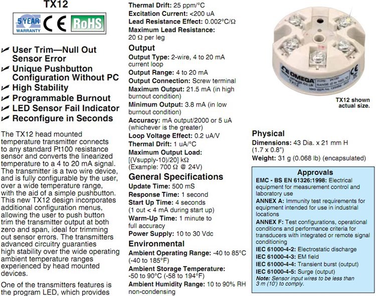 美国OMEGA奥米佳TX12,TX13温度变送器TX2-100,TX-SCALED,TX12,TX13