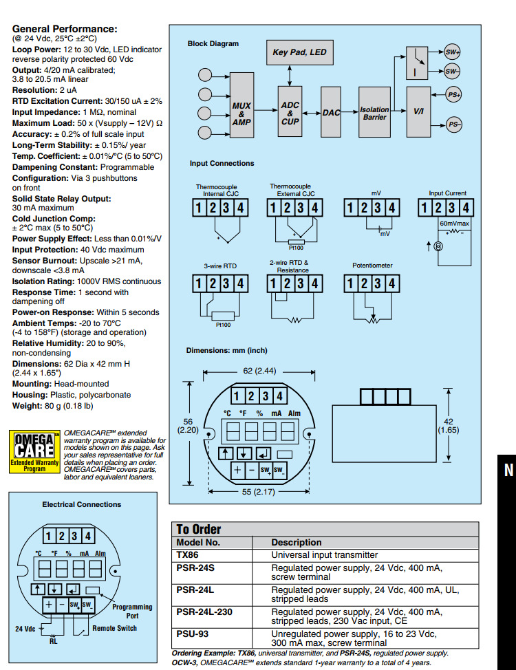 美国OMEGA奥米佳温度变送器TX86适用于热电偶RT毫伏输入和热电阻TX86