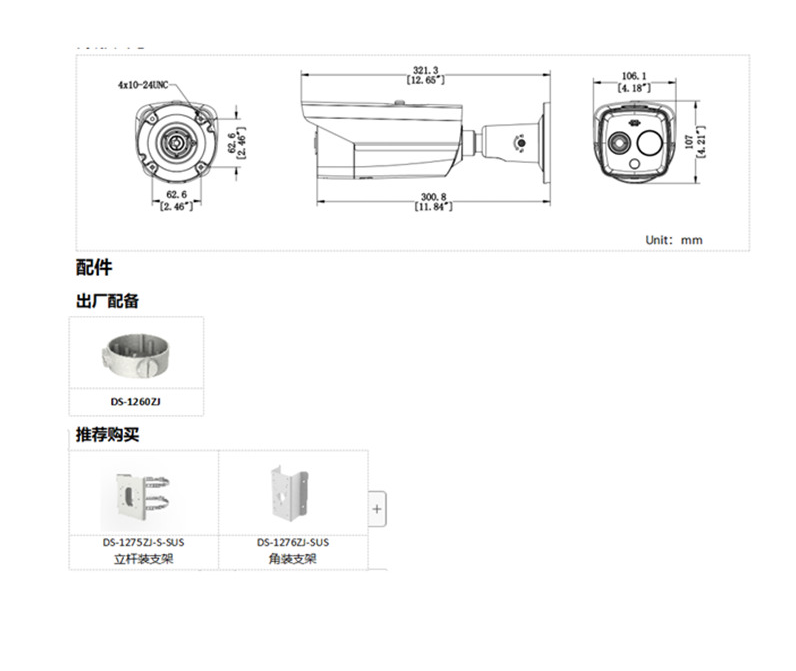 DS-2TD2628T-10/QA 海康威视测温型热成像筒型网络摄像机 DS-2TD2628T-3/QA DS-2TD2628T-7/QA 推荐配件: