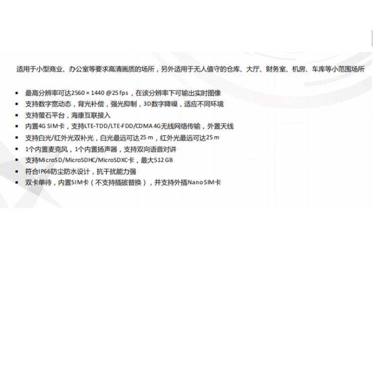 DS-2DE2Q140MY-T/GLSE 海康威视400万4G定焦PT球型摄像机 1/2.7"CMOS 固定焦距2.8mm/4mm可选 分辨率可达2560 × 1440 @25 fps 支持数字宽动态,背光补偿,强光抑制,3D数字降噪 支持萤台,海康互联接入 内置4G SIM卡,支持LTE-TDD/LTE-FDD/CDMA 4G无线网络传输,外置天线 支持白光/红外光双补光,白光zui远可达25米,红外光zui远可达25米 1个内置麦克风,1个内置扬声器,支持双向语音对讲 双卡单待,内置SIM卡(不支持插拔替换),并支持外插Nano SIM卡 DS-2DE2Q140MY-T/GLSE