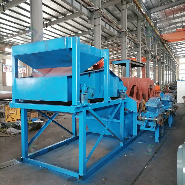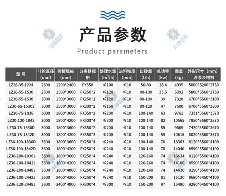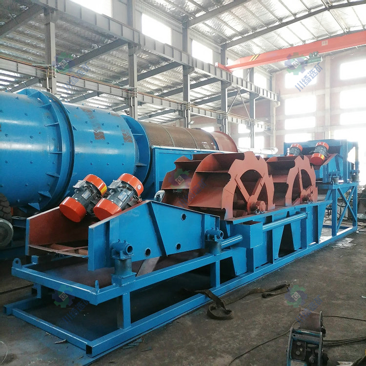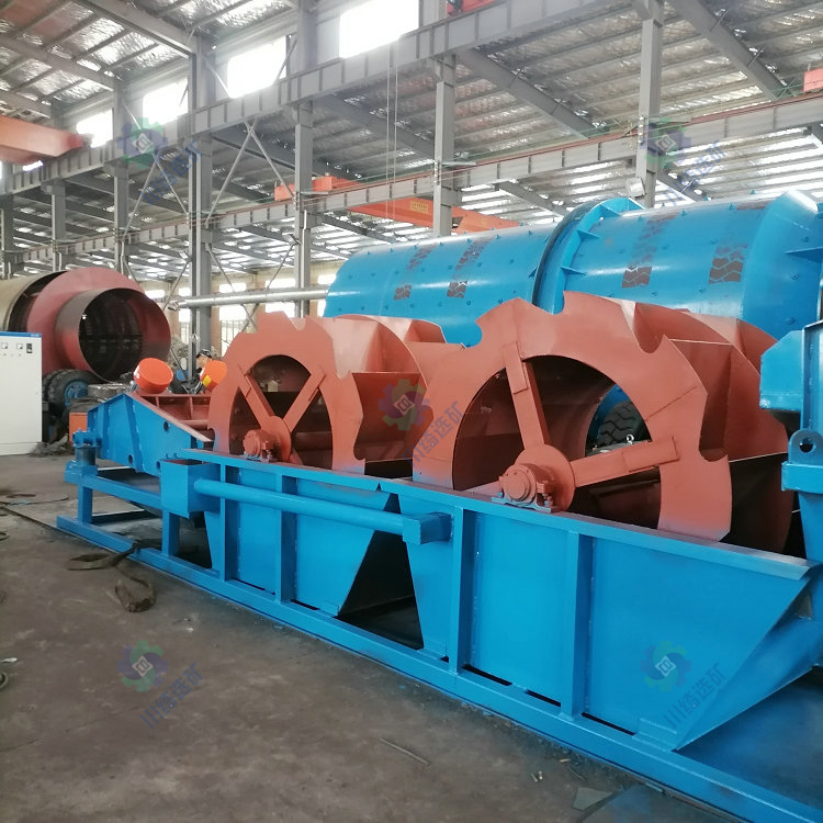 经电动机、减速机的传动,驱动水槽中的叶轮不停的在水槽中作圆周性转动,从而将水槽中的砂石或矿渣颗粒物料在水中搅拌、翻转、淘洗并使受水物料在叶轮中脱水后排出。工作时,电机通过三角带、减速机、齿轮减速后带动叶轮缓慢转动,砂石由给料槽进入洗槽中,在叶轮的带动下翻滚,并互相研磨,除去覆盖砂石表面的杂质,同时破坏包覆砂粒的水汽层,以利于脱水;同时加水,形成强大水流,及时将杂质及比重小的异物带走,并从溢出口洗槽排出,完成清洗作用。