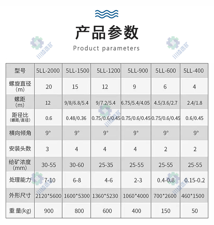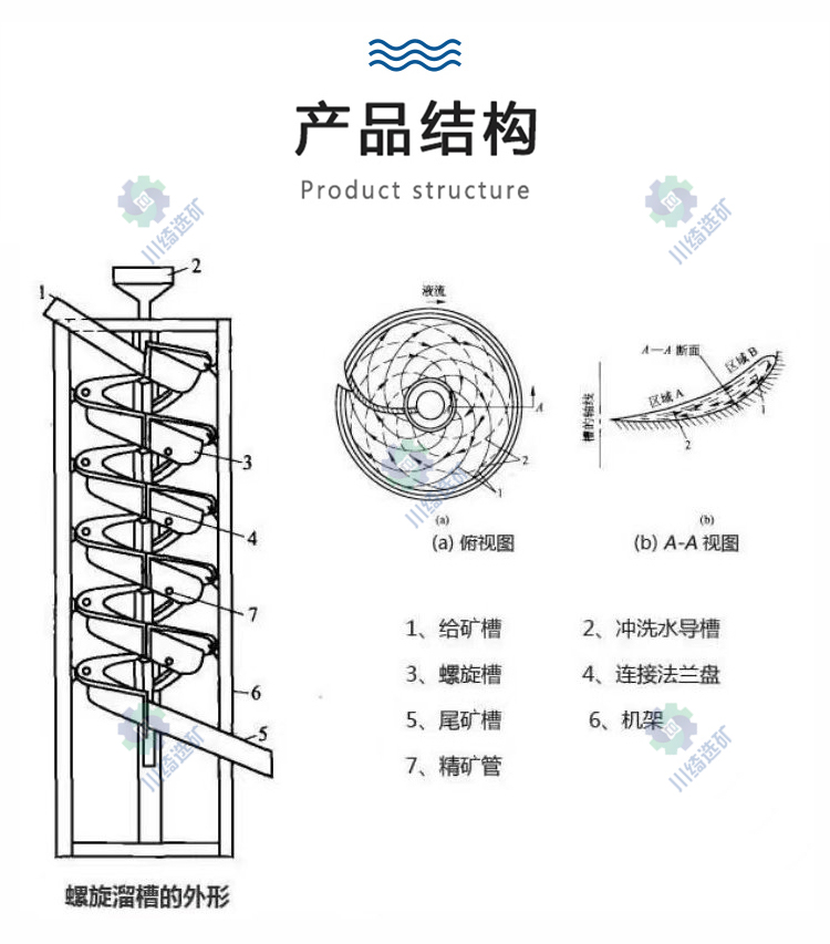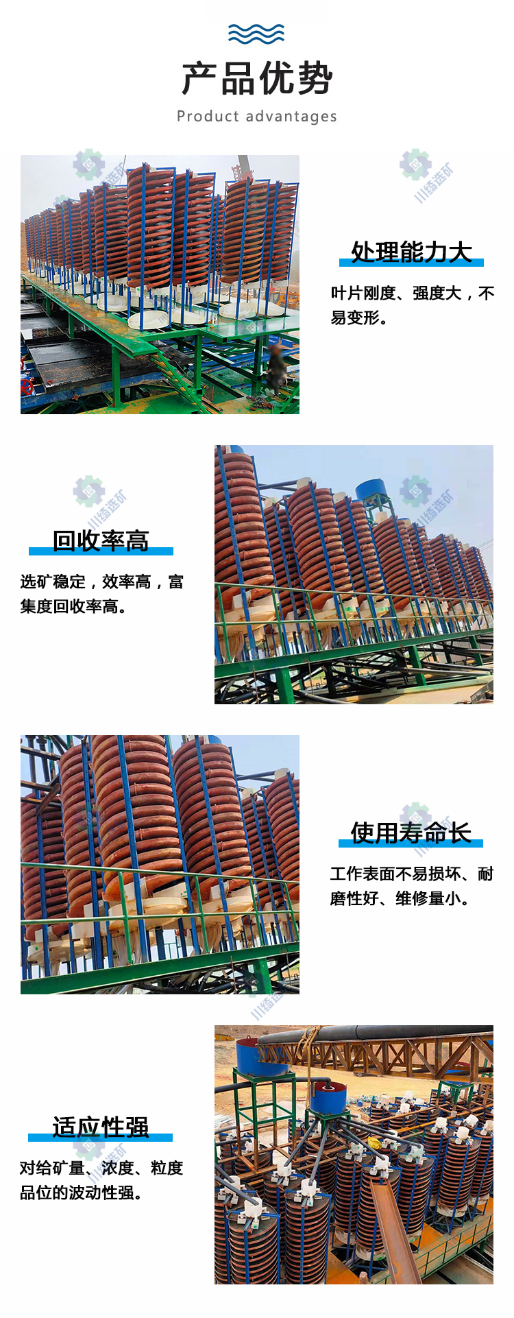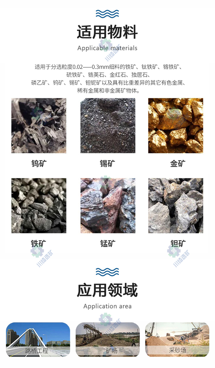 产品具有结构合理,安装简单,占地面积少,操作简易,选矿稳定,分矿清楚,处理量大选矿富集比高、回收高,运转可靠的特点。具有重量轻、防潮、防锈、对给矿量和浓度、粒度、品位的波动适应性强,无噪音等优点。