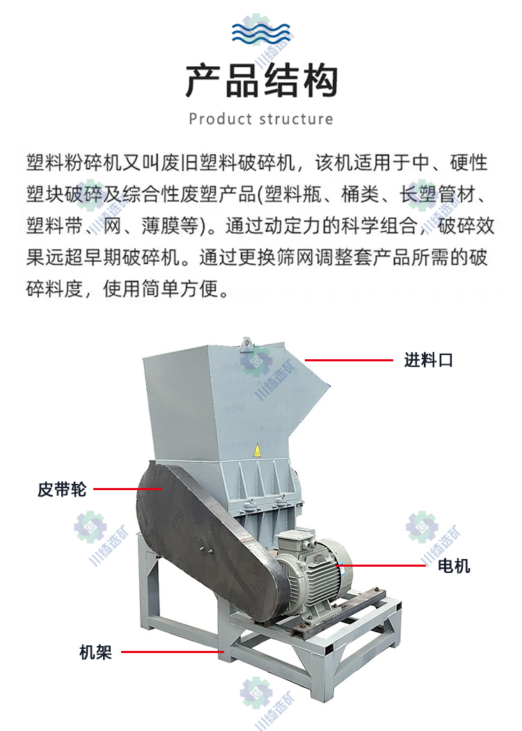 塑料粉碎机(plastic mill)指粉碎各种塑性塑料和橡胶如塑料异型材、管、棒、丝线、薄膜、废旧橡胶制品。粒料可直接供挤出,作为生产原料。