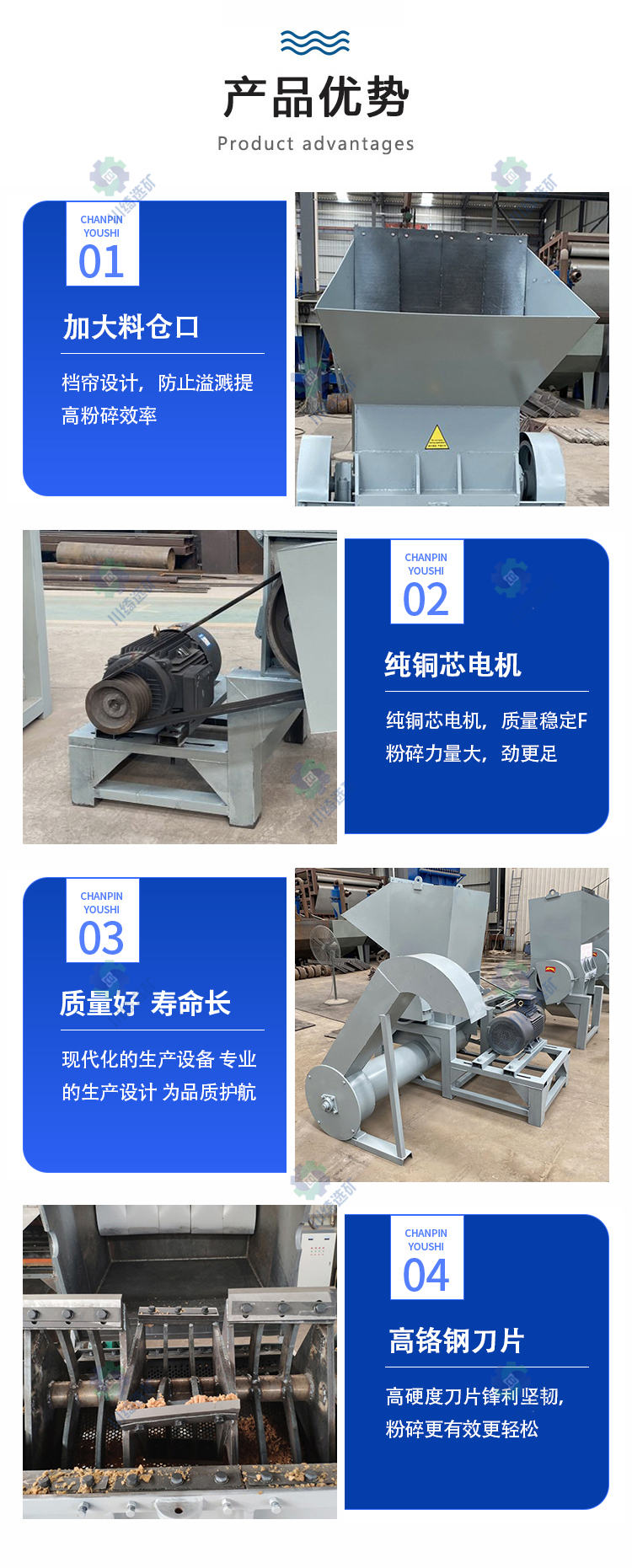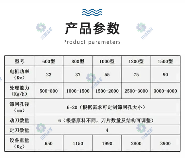 此类机械采用合金钢刀片,寿命长;同时,该械采用分离设计,易于检修和清洗,并有双层结构,装有隔音材料,噪音很低,刀轴座经过严格的平衡试验,机台底座并装有四轮,移动方便。