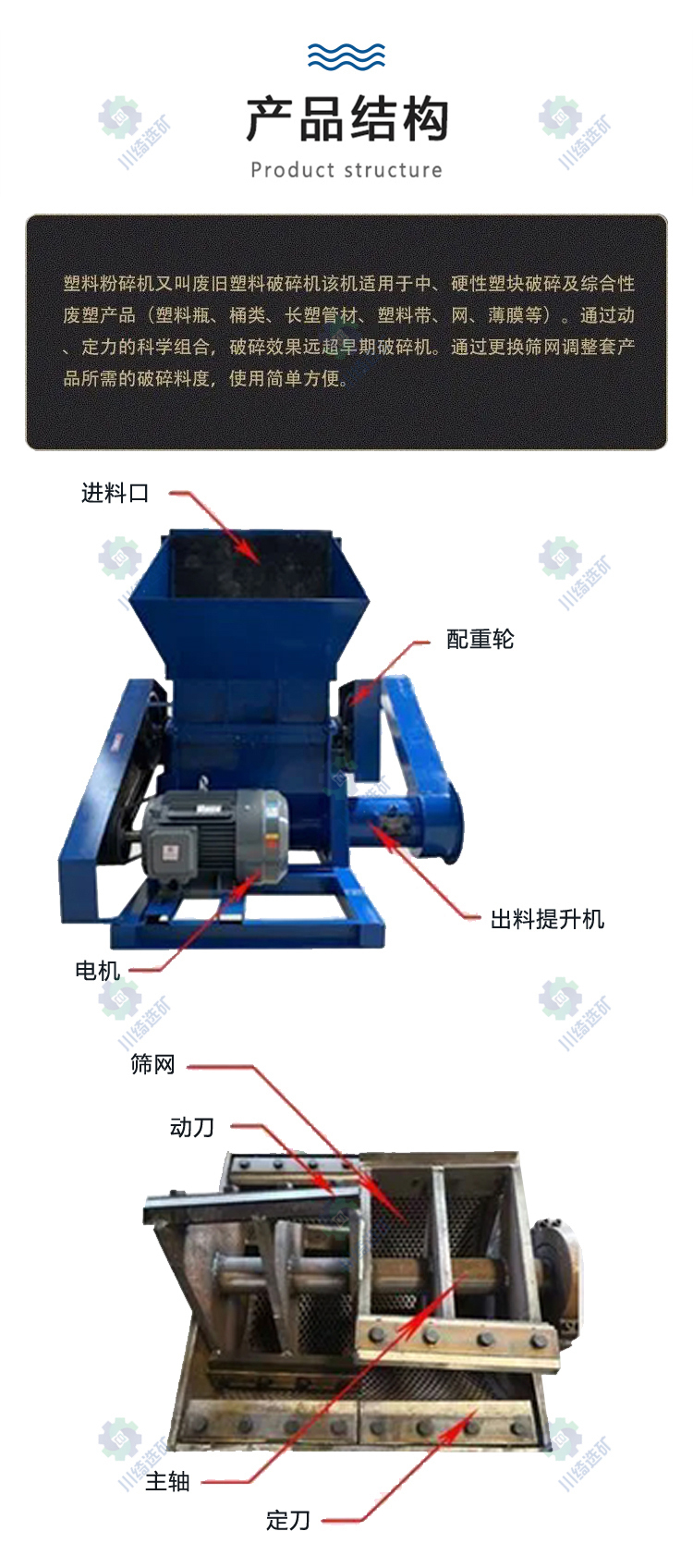 塑料粉碎机(plastic mill)指粉碎各种塑性塑料和橡胶如塑料异型材、管、棒、丝线、薄膜、废旧橡胶制品。粒料可直接供挤出,作为生产原料。