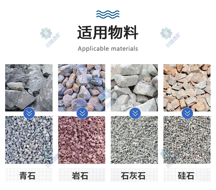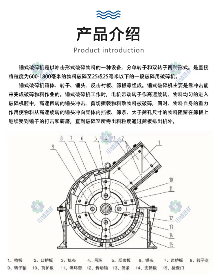 通过筛板排出,大于筛孔尺寸的物料阻留在筛板上继续受到锤子的打击和研磨,直到破碎至所需出料粒度通过筛板排出机外。锤式破碎机适用于破碎抗压强度180MPa以下的石灰石、煤矸石、石膏、页岩等各类中硬脆性物料的粗、中、细碎作业。