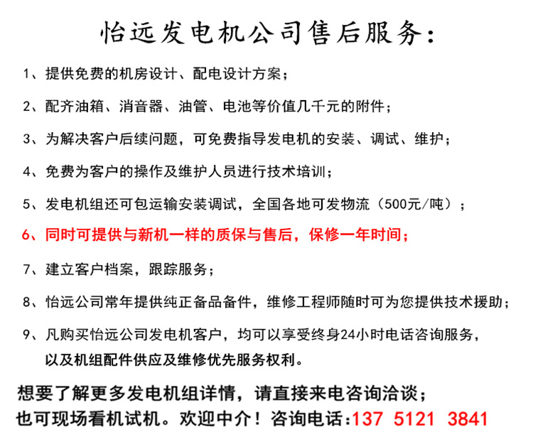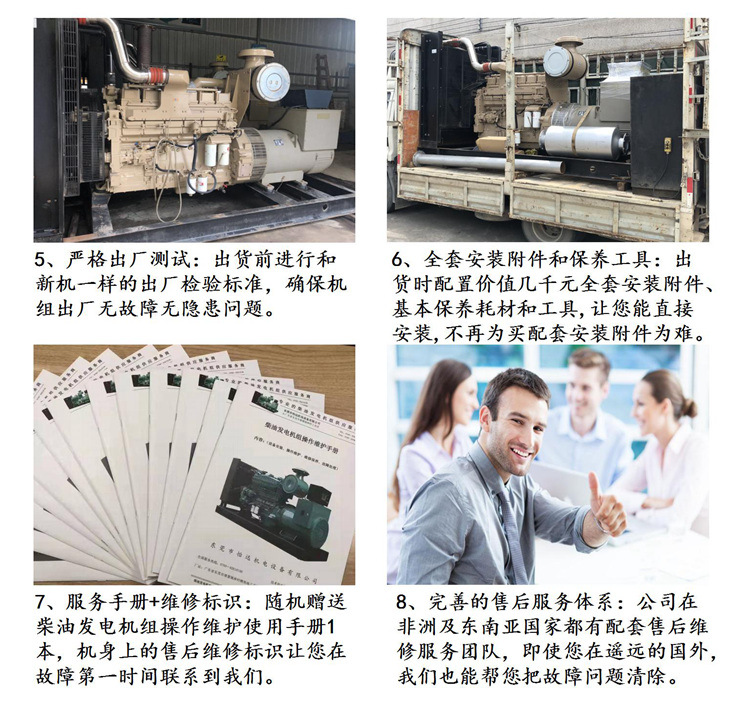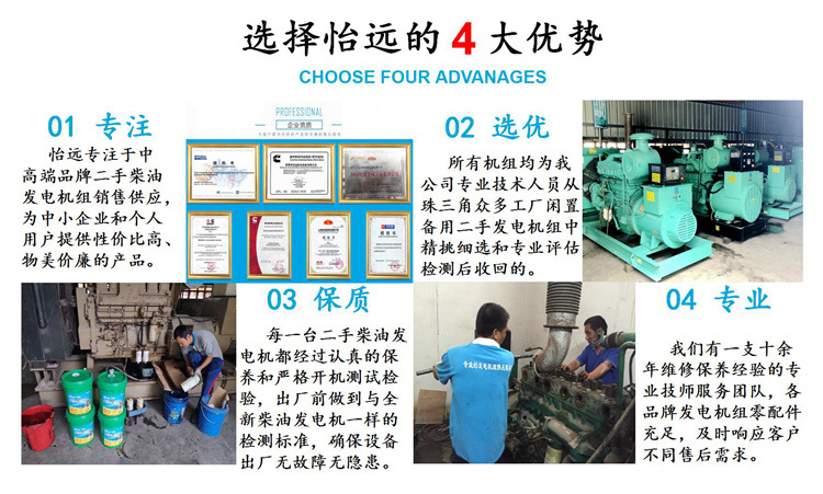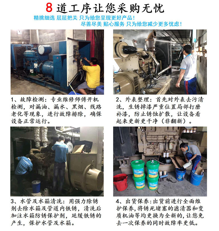 我公司出售的每一台发电机组都是从珠三角地区,工厂、酒店等企事业单位回收的应急备用发电机组,每一台机器在拉回仓库时,都有的技师对外观进行清洗、更换三滤机油、负载测试等,确保每一台发电机到用户手里都能够放心发电使用。