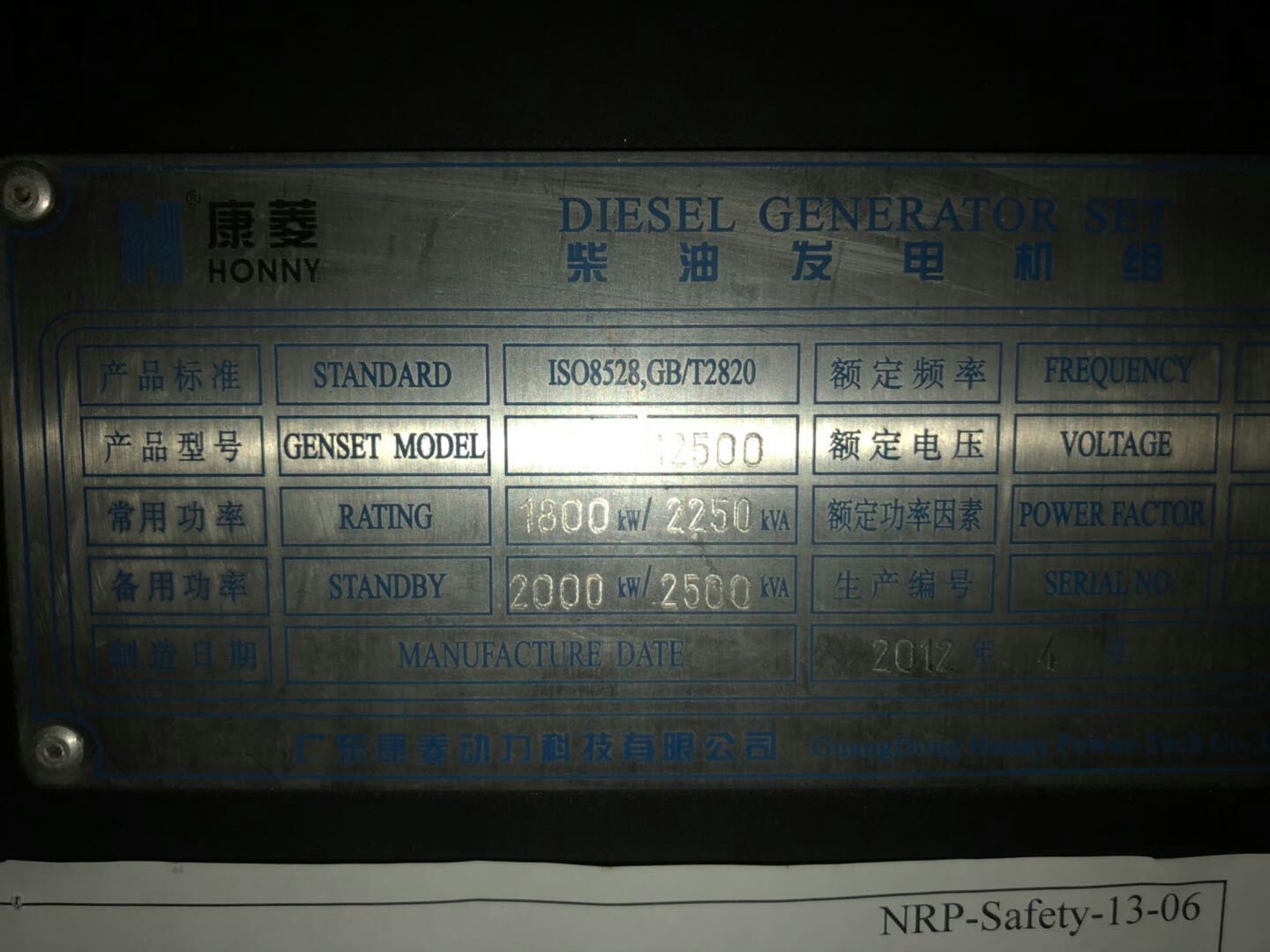 2000kw科克柴油发电机组,从广州一家电信公司回收的备用发电机。上市公司康菱2012年出品,机器九五成新,累计使用了112小时。机器没有动过螺丝,机组状况良好,能长时间持续发电使用。