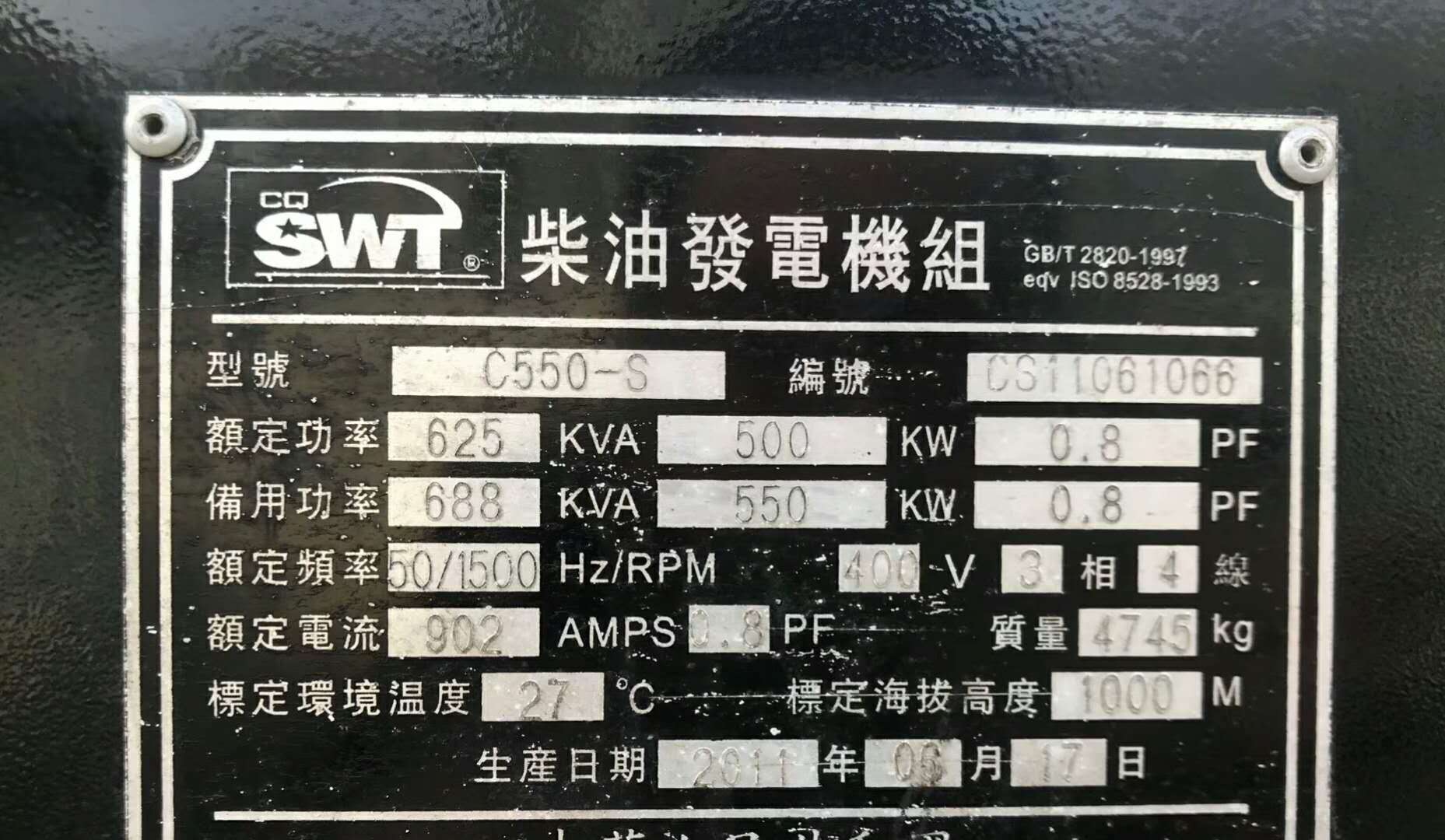 500KW重庆康明斯二手柴油发电机组。康明斯直属公司,重庆赛瓦特出品。之前是一家写字大楼应急消防备用发电机,很少使用,累计运行时间35小时,机器没有动过螺丝,外观成色八五成新。 整机高配置斯坦福电球、电脑智能控制系统,操作简单,一键启动,一键停机,正太机组带自保护功能,使用过程中有任何问题,机组会进行强制停机。机组带自启动、无人值守功能。