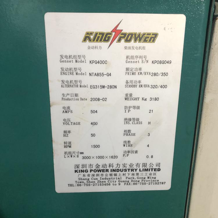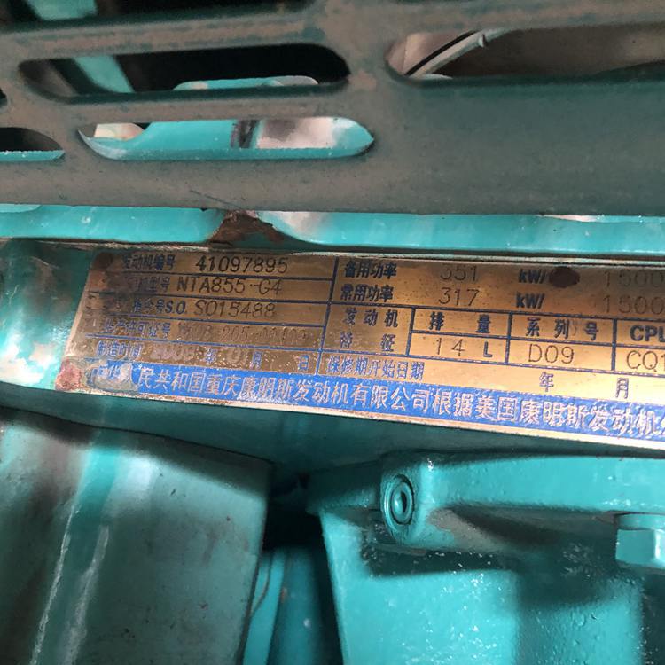 出售一台9成新的重庆康明斯310kw二手柴油发电机组,今天刚回收回来的,洗都没来得急清洗,深圳金动公司2008年组装生产的,大公司组装工艺更好,质量更可靠,成色真心的好啊,原装机组没有维修过的,型号:NTA855-G4,连发动机裸机标签都还在,配置也是好的不要不要的,进口英格三相无刷电机和全电脑智能型控制器,总共才用了140小时,是的你没有看错,只用了140小时的二手发电机,你自己说这样的机可靠不可靠,可以说是磨合期都没有用完啊,喜欢的老板请私聊我,或者来电咨询,标价非卖价,非诚勿扰!