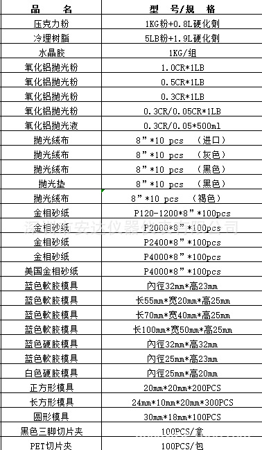 我们还有金相砂纸,金相抛光绒布,金相水晶胶,压克力粉等。