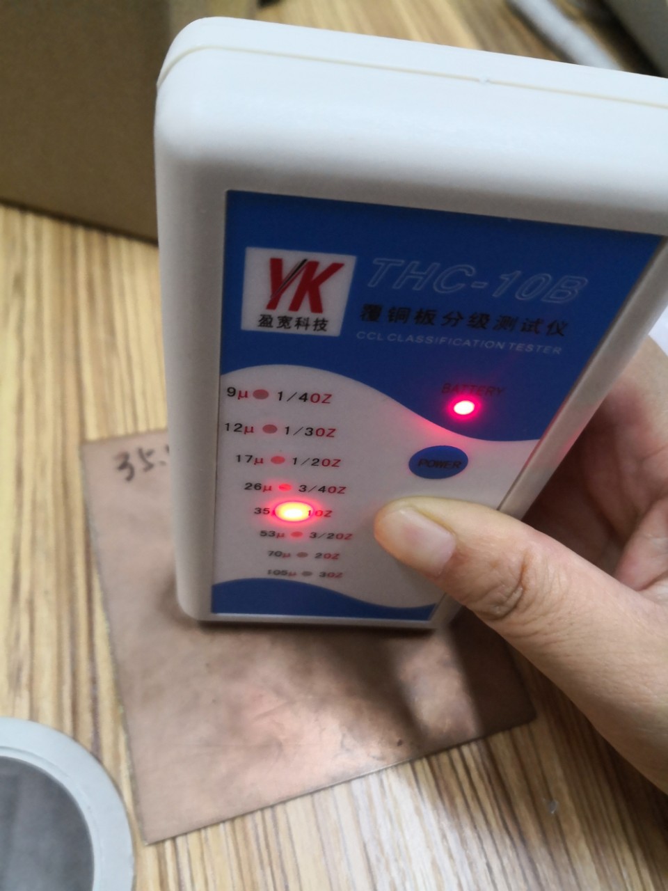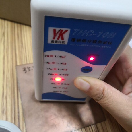 3、 此时仪器面板上有一只LED亮,其指示对应的厚度即为该铜箔厚度。
