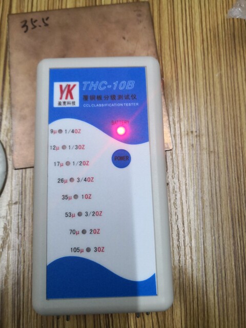 一、用途 当您作为专业线路板厂采购人员欲购买覆铜板,对铜箔厚度产生疑问时,当您作为材料检验或车间生产质检人员,对基板的铜箔把握不准时,您可能会有深刻体会,要是有一台可以装在口袋里随时可以对覆铜板进行复检的“覆铜板分级测试仪”就好了。本公司生产的覆铜板分级测试仪就可满足您以上的愿望,只需要一秒钟就可以测出覆铜板铜箔的厚度,非常方便,测试数据稳定可靠。 二、技术参数