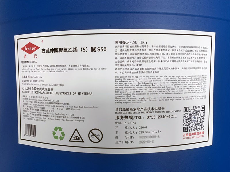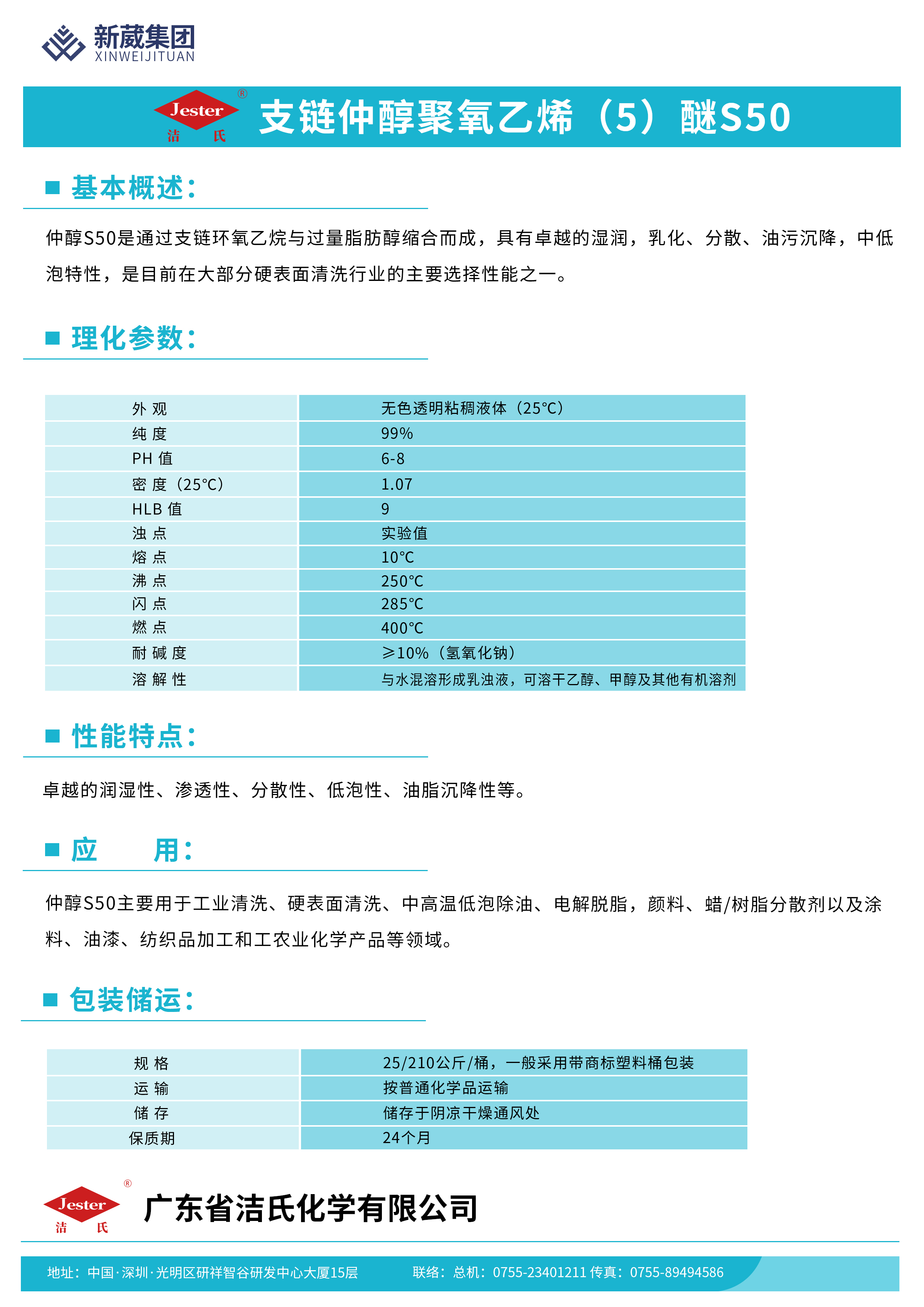 仲醇S50主要用于工业清洗、硬表面清洗、中高温低泡除油、电解脱脂,颜料、蜡/树脂分散剂以及涂料、油漆、纺织品加工和工农业化学产品等领域。