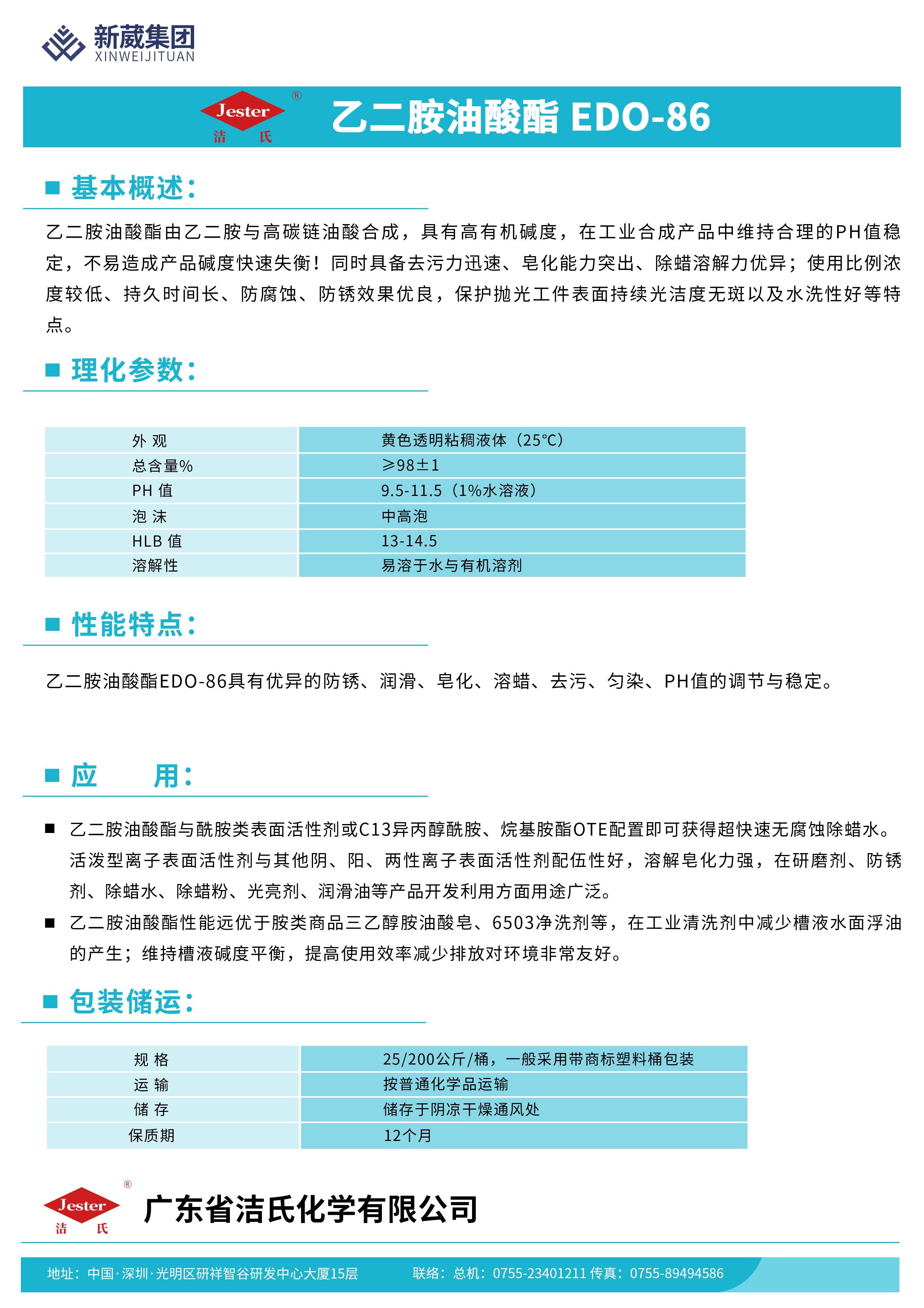 EDO-86具有优异的防锈、润滑、皂化、溶蜡、去污、匀染、PH值的调节与稳定。