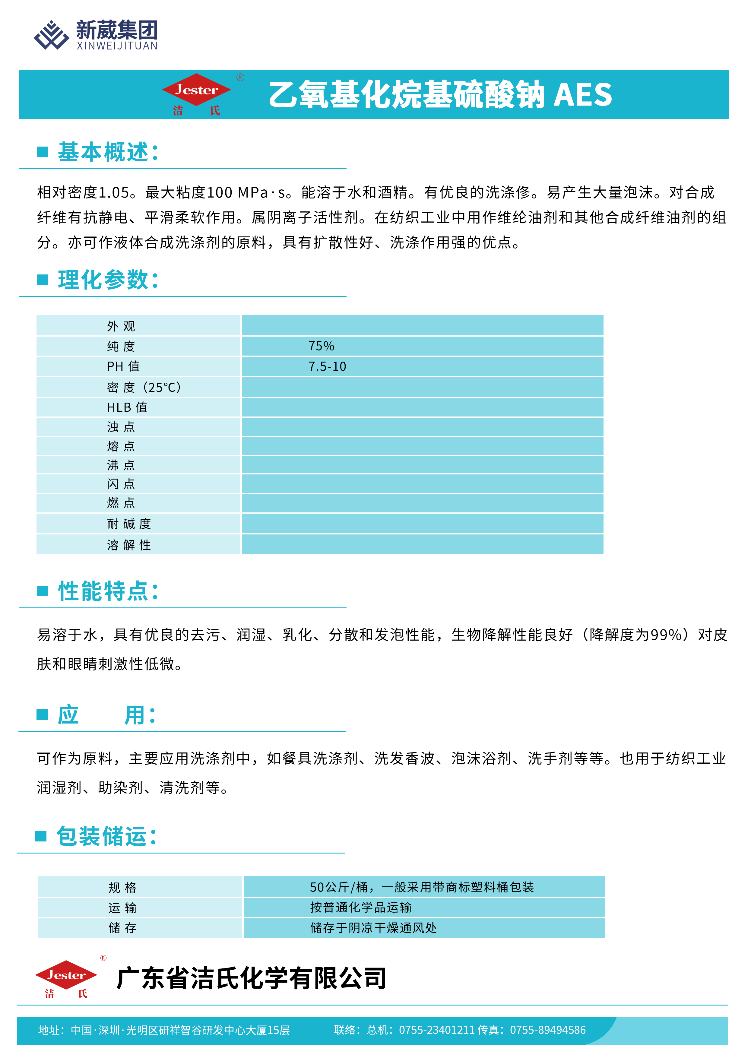 相对密度1.05。最da粘度100 MPa·s。能溶于水和酒精。有优良的洗涤修。易产生大量泡沫。对合成纤维有抗静电、平滑柔软作用。属阴离子活性剂。在纺织工业中用作维纶油剂和其他合成纤维油剂的组分。亦可作液体合成洗涤剂的原料,具有扩散性好、洗涤作用强的优点。