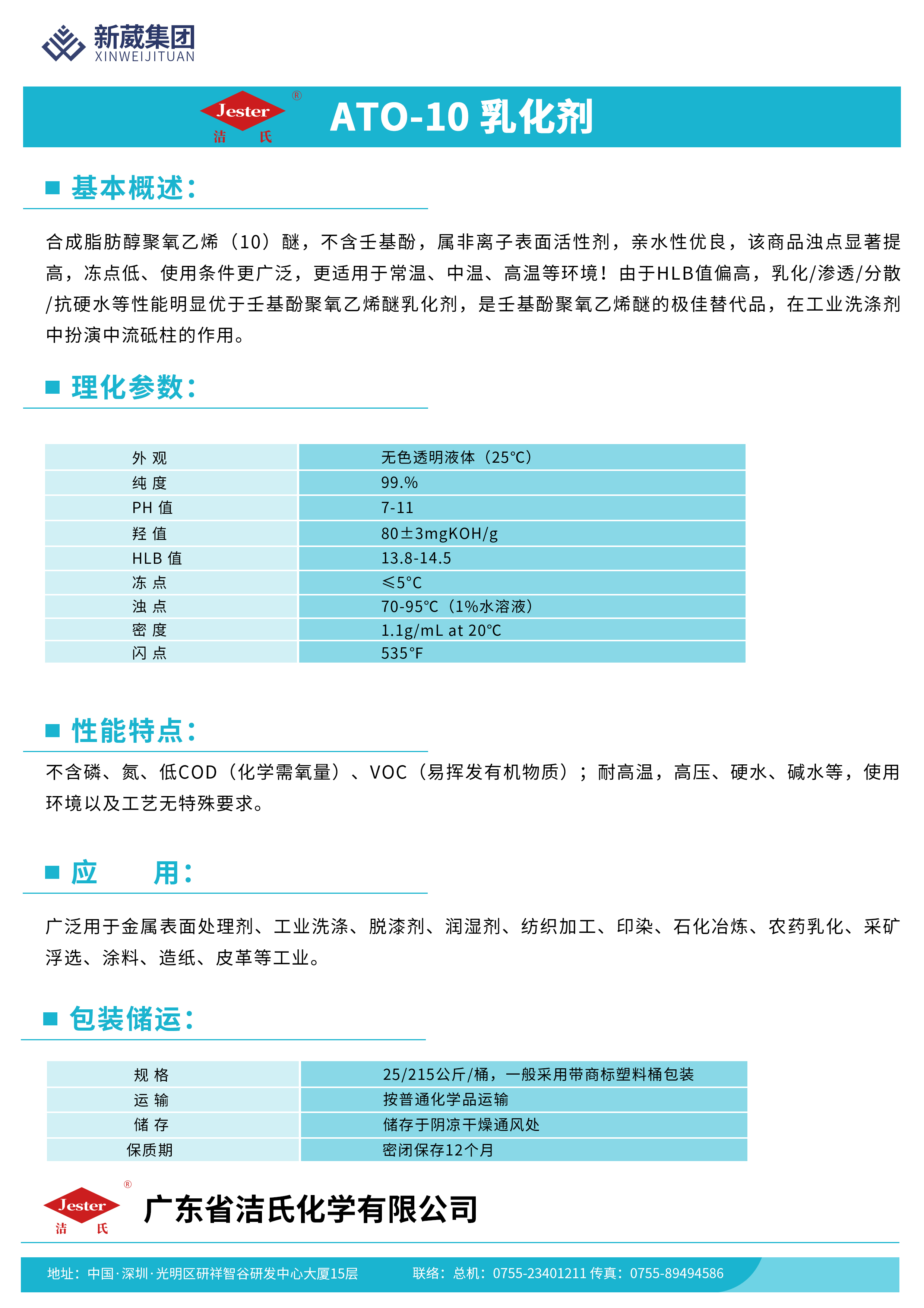 不含磷、氮、低COD(化学需氧量)、VOC(易挥发有机物质);耐高温,高压、硬水、碱水等,使用环境以及工艺无特殊要求。