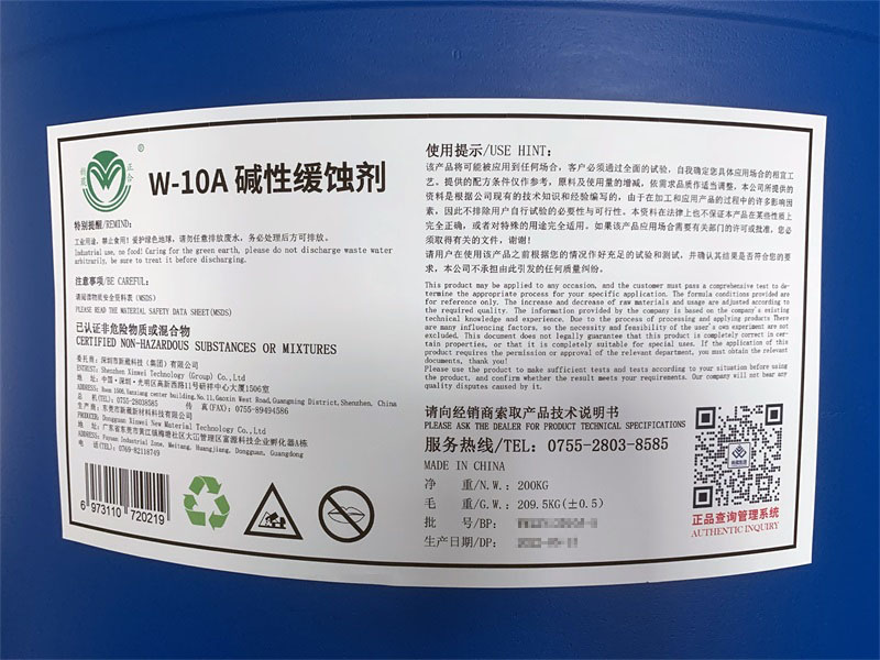 W-10A碱性缓蚀剂由聚合钾无机化合物复配而成,不含磷、氮元素、环保要求较高,与大多数常用无机碱盐互溶不发生排斥现象。在碱性清洗剂中缓蚀效率优秀,特别是对有色金属缓蚀评价颇高。
