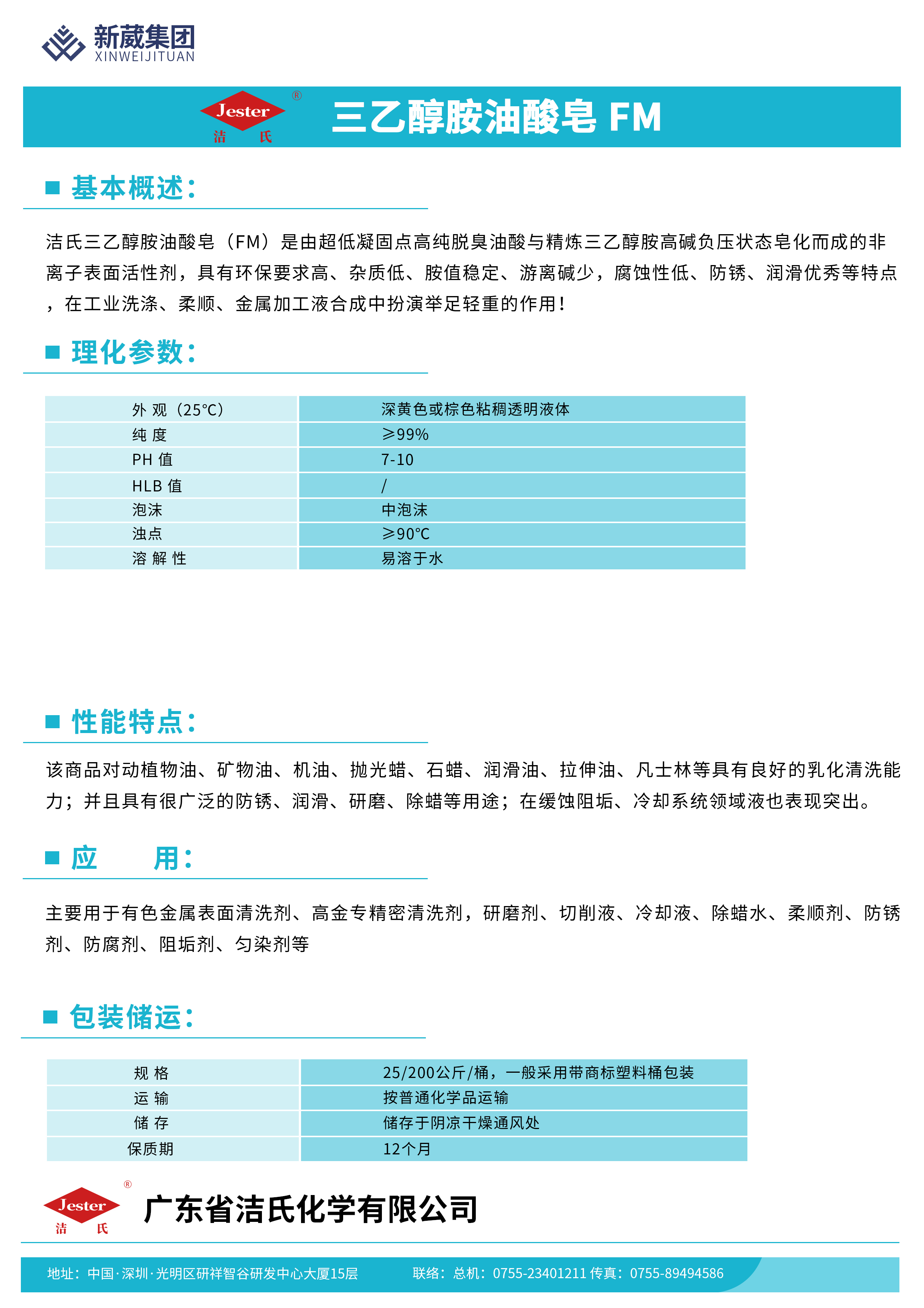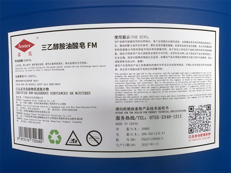 洁氏三yi醇胺油酸皂(FM)是由低凝固点高纯脱臭油酸与精炼三yi醇胺高碱负压状态皂化而成的非离子表面活性剂,具有环保要求高、杂质低、胺值稳定、游离碱少,腐蚀性低、防锈、润滑优秀等特点在工业洗涤、柔顺、金属加工液合成中扮演举足轻重的作用!