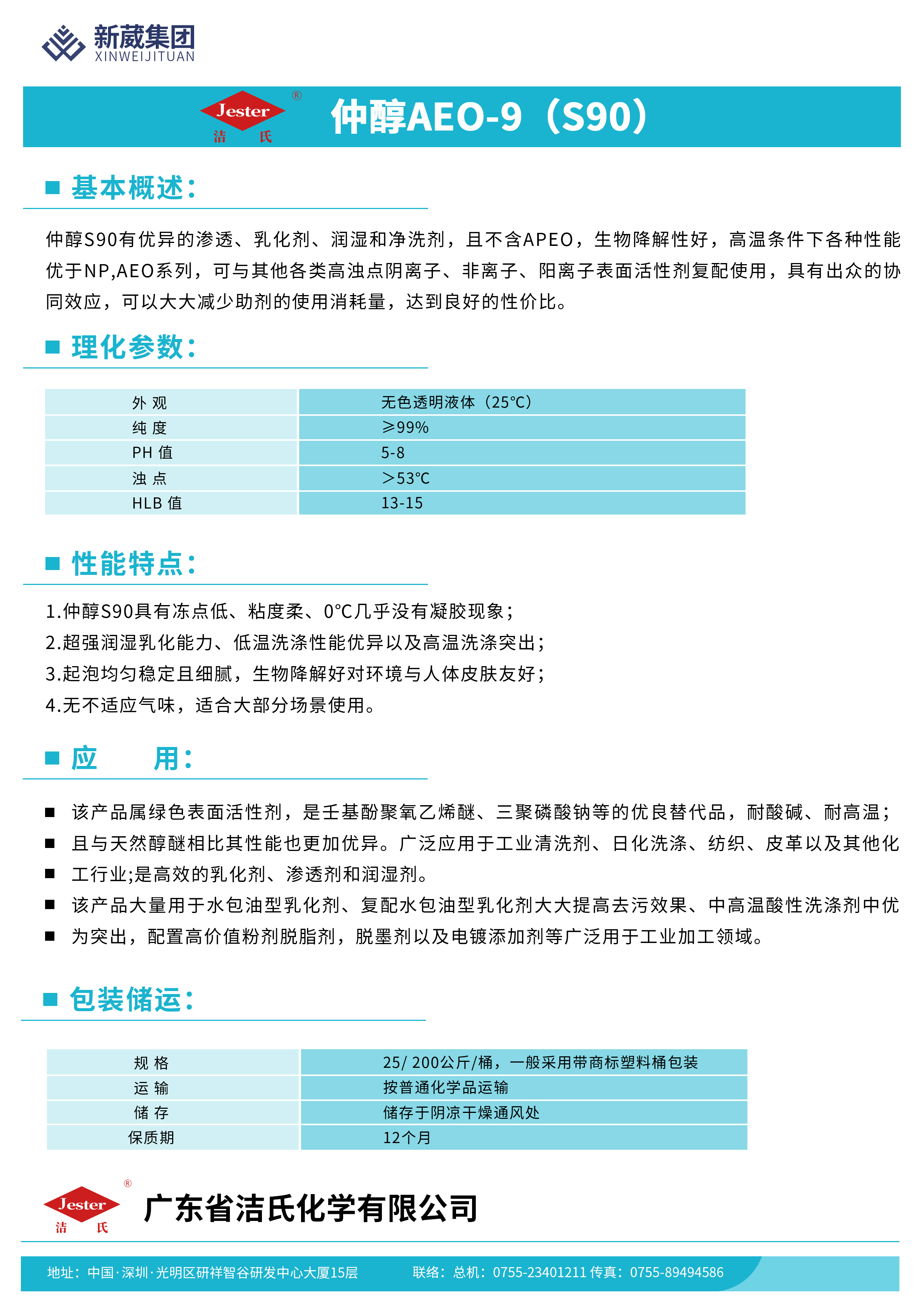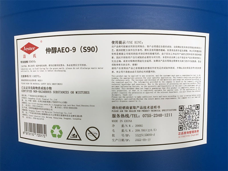 仲醇S90有优异的渗透、乳化剂、润湿和净洗剂,且不含APEO,生物降解性好,高温条件下各种性能优于NP,AEO系列,可与其他各类高浊点阴离子、非离子、阳离子表面活性剂复配使用,具有出众的协同效应,可以大大减少助剂的使用消耗量,达到良好的性价比。
