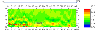 3.横坐标范围0-28m,深度2.5-4m范围内存在断断续续的红、蓝条纹,表示混凝不均匀,存在结构差异较大的界面,不密实。推断或因骨料粒度过大、或因振捣不足所致。已在图中用红色虚线框圈定了其位置。