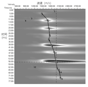 由滤波后数据,进行速度扫描,反演出激发点下方混凝土的波速分布,从而重建混凝土构件内的波速分布。图7为散射/反射强度成像,纵坐标是零偏移距的双程时,横坐标是界面的偏移速度,能量强的极值点表示存在强反射/散射界面。时间与速度的乘积的一半是深度。黑色极值点(图中十字所标注的极值点)表示弹性波阻抗差为正,增速界面,反之为减速界面。极值点的选择方式为自动+交互(算法自动拾取与手动选点结合)。