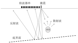 Cscan声波散射成像技术是在地震学中散射、反射基础上发展起来的新技术。它以非均匀介质模型为基础,借助散射波对结构界面和介质波速进行成像,实现对混凝土结构精细检测的目的。同一种工程材料,当其密实性和胶结程度等存在不均匀性时,如存在松散、空鼓等情况,会出现局部的弹性波阻抗的异常区。这些弹性波阻抗差异界面,以及材料不均匀性引起的弹性波阻抗异常区,都是散射源,在冲击波的激励下散射源会产生散射波,如图1所示。弹性波阻抗差异越大,散射波能量越强。通过接收到的散射波的走时、幅值,可对异常体的位置、形态进行精细成像,从而确定混凝土内部缺陷的位置。弹性波会在尺寸远远大于波长的弹性波阻抗差异界面形成反射,这是反应介质分层特性最直接的指标,是物探解释的主要依据。通过定位混凝土构件的底部强反射界面,确定混凝土构件的底界面位置,这是检测的物理基础。声波散射成像技术已成功应用于风电塔的基础混凝土质量检测。