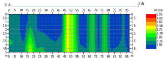 图10所示的速度剖面图像中,横坐标为水平坐标,纵坐标为深度坐标。图像的色标表示混凝土内部的波速分布情况。红色表示高波速,混凝土坚硬,蓝色表示低波速,混凝土松软。检测结果显示: