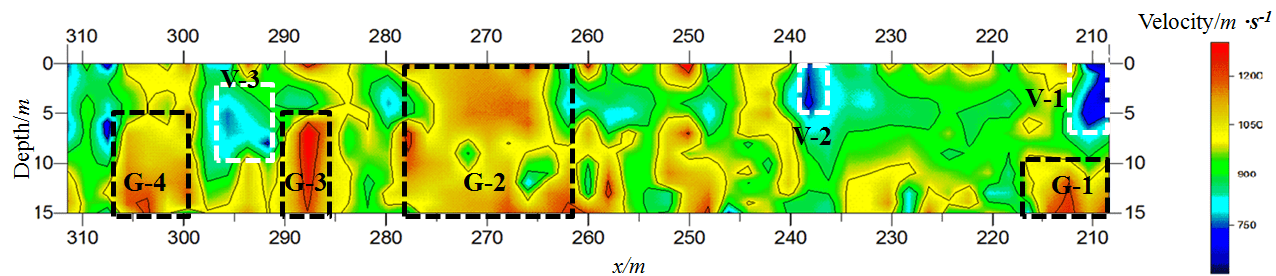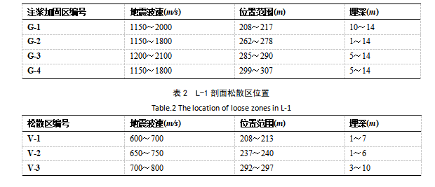 注浆后地层中既有注浆形成高速注浆加固体,也可能有残留的缺陷,地下工程施工形成的土体缺陷主要有三类:疏松、松散和空洞,其波速依次降低。根据大量的工程经验可知:与原位正常地层比较,疏松区波速降低10-20%,松散区波速降低20%-40%,空洞区波速降低超过40%,注浆加固区的波速增高20%以上,且波速增高得越多注浆效果越好。