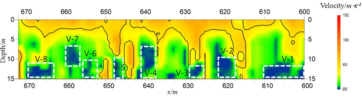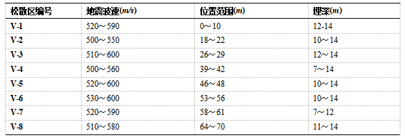 R-6剖面的地层波速见图3,图中红色和黄色为高波速区域,蓝色区域为低波速区域。剖面内未见注浆加固迹象,浅部波速较高,地层稳定,深度大于7m的范围内发育有8处松散区,低速松散区规模不大,但波速较低,其位置、规模见表3。