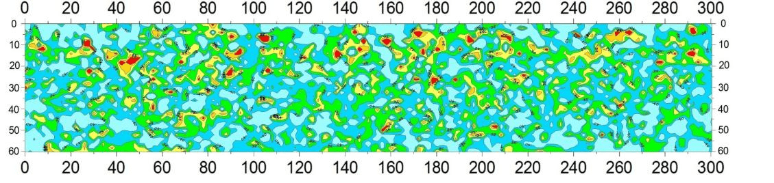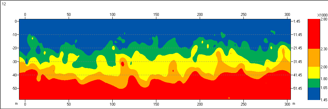 经过数据处理,生成勘探区三维波速分布与地质界面分布的数据结构。数据在隧道轴线方向点距1m,横向方向点距2m,垂直方向点距0.5m。该三维数据结构支持水平、纵向、横向切片分析。测区基岩的波速大于2400m/s,根据这个速度值可确定了隐伏基岩与孤石的高程平面分布。对三维数据结构进行纵、横、水平方向的切片,给出波速与地质剖面。从埋深20m到50m给出30幅水平切片,间距1m;按隧道里程给出波速横切片300幅,间距1m。这些切片直观、准确地反应了孤石的空间位置与形态。