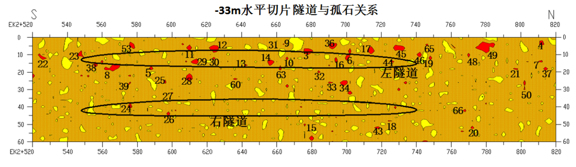 水平切片能直观地反映孤石的平面位置,这里选择埋深33m的水平切片示于图7。图中红色表示的波速高于2400m/s的孤石与基岩突起;褐色表示波速为2000-2400m/s的强风化岩;黄色为波速1800-2000m/s的全风化与黏土。图中黑色椭圆曲线表示隧道的交线,由此可直观地发现与隧道有关的孤石的位置,并进行了编号统计,发现多数孤石分布在左侧隧道位置。