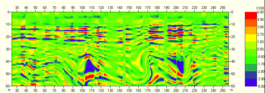在获得了波速分布的基础上,使用滤波后的地震记录,通过偏移成像获得地质界面的形态分布。偏移成像的物理量是散射系数α,其数字表征地质界面上地层模量差异的大小。偏移成像的地质界面与速度的分布是一致的,两者可互相印证。