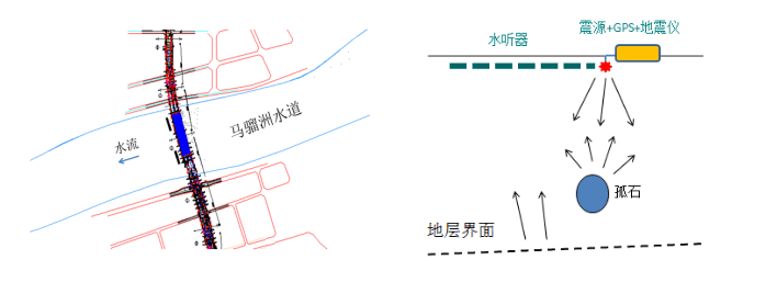 图3 水上孤石勘探区位置 图4 水上地震散射数据采集方式